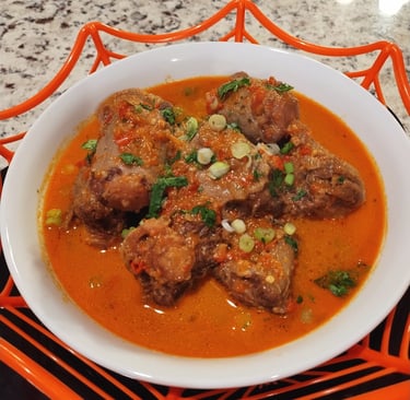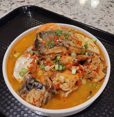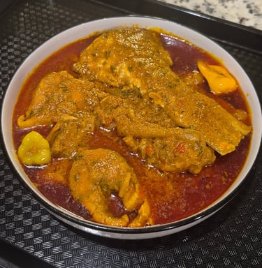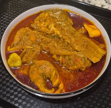 A hearty palm fruit soup cooked in a savory blend of spices, meats, and seafood, delivering an authentic taste of West Africa in every spoonful.