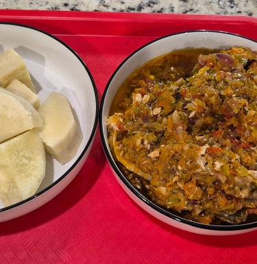 Soft, perfectly cooked yam paired with a flavorful fish stew simmered in a rich tomato and pepper sauce — simple, hearty, and delicious.